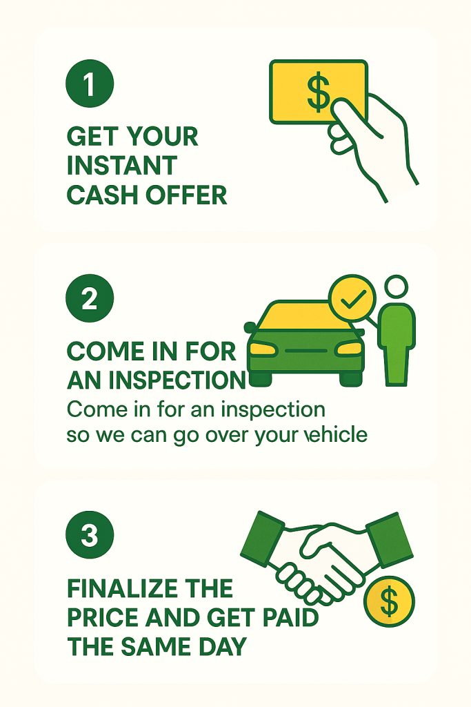It’s easy! Enter your vehicle information. We’ll set up an appointment so we can view and inspect your vehicle. Once that’s done, we access a network of dealers competing to get you the highest offer.